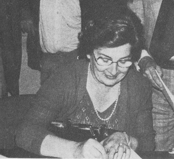Giuseppina Ajolfi alle prese con le firme autografe alla presentazione del suo primo libro "Zoccoletti" (1980)